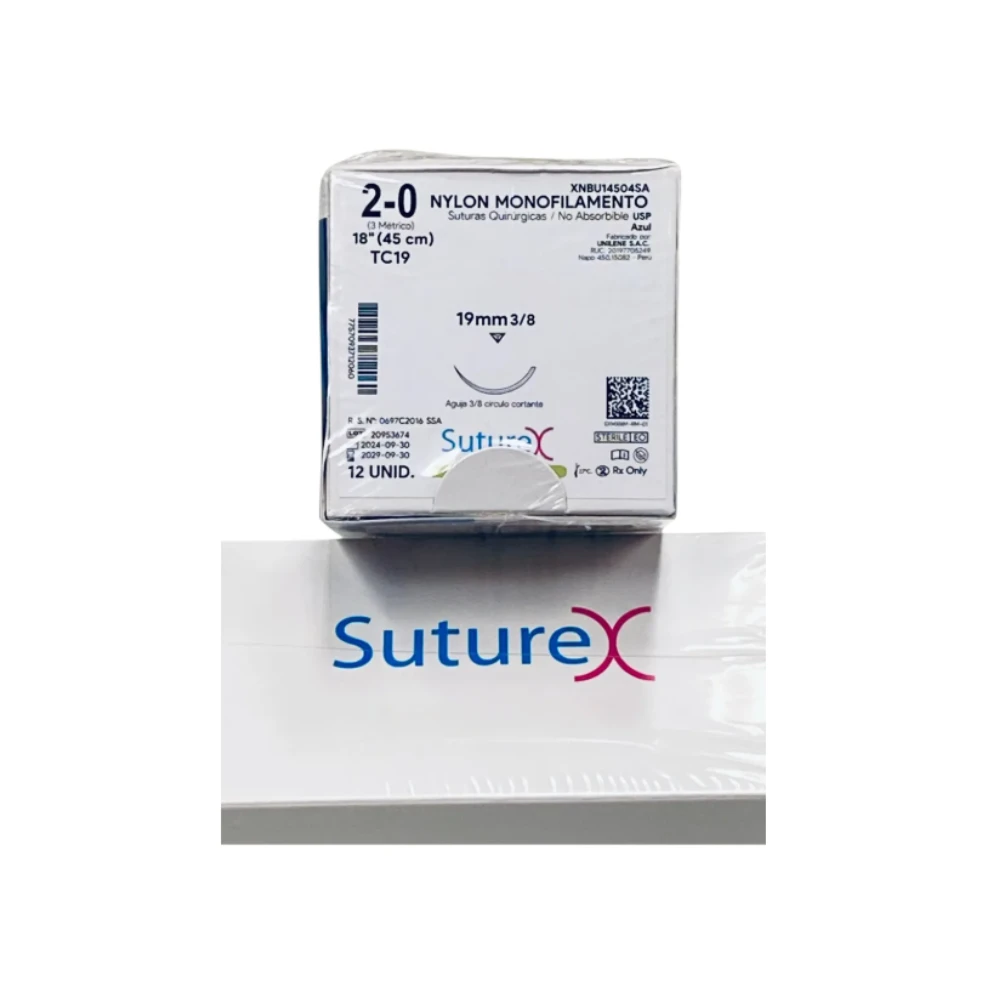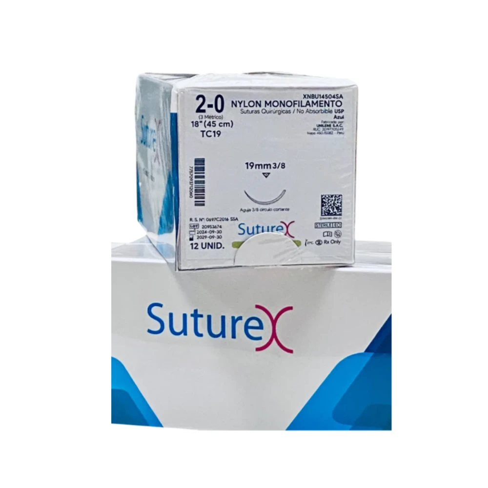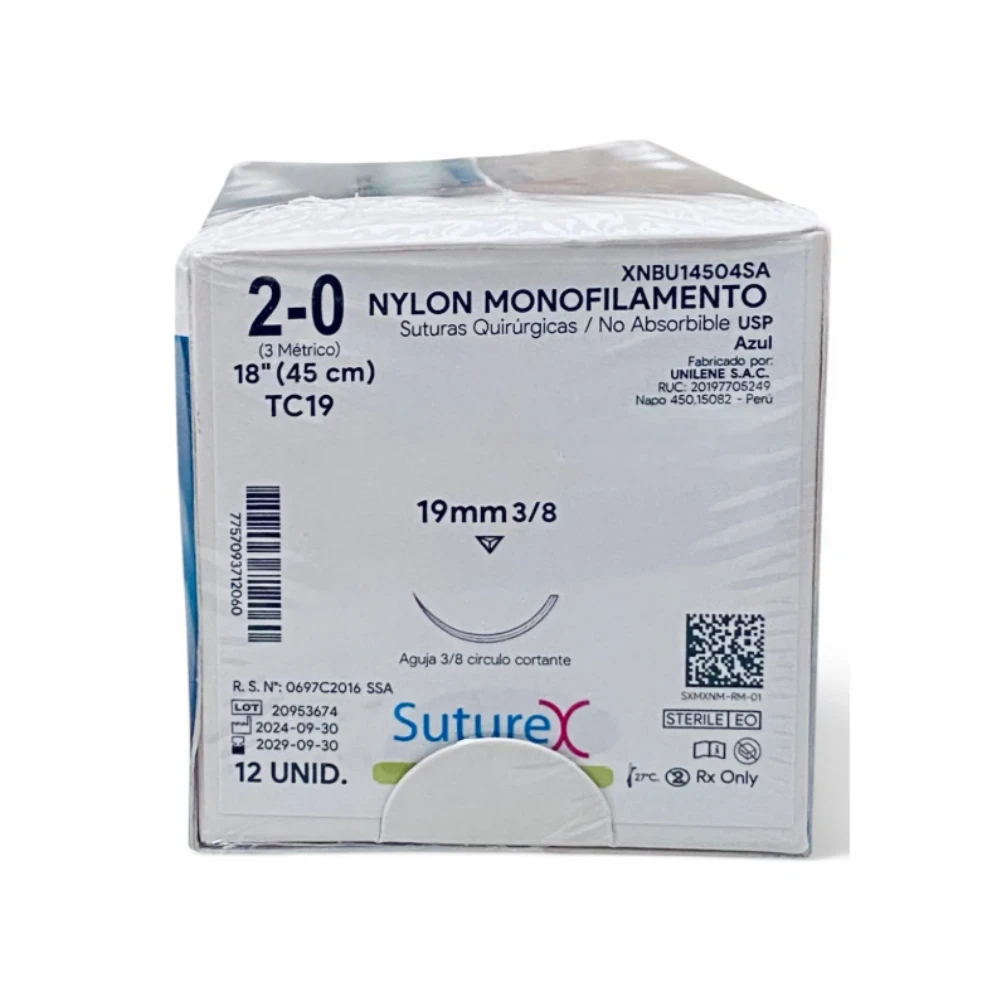 Sutura de nylon no absorbible, 2-0 aguja 19 mm, 3/8 círculo reverso cortante para penetración precisa y menor trauma tisular. Longitud estándar 45 cm; color azul/negro para alta visibilidad. Indicada para cierre de piel y tejidos de alta resistencia. Presentación: caja con 12 piezas estériles.