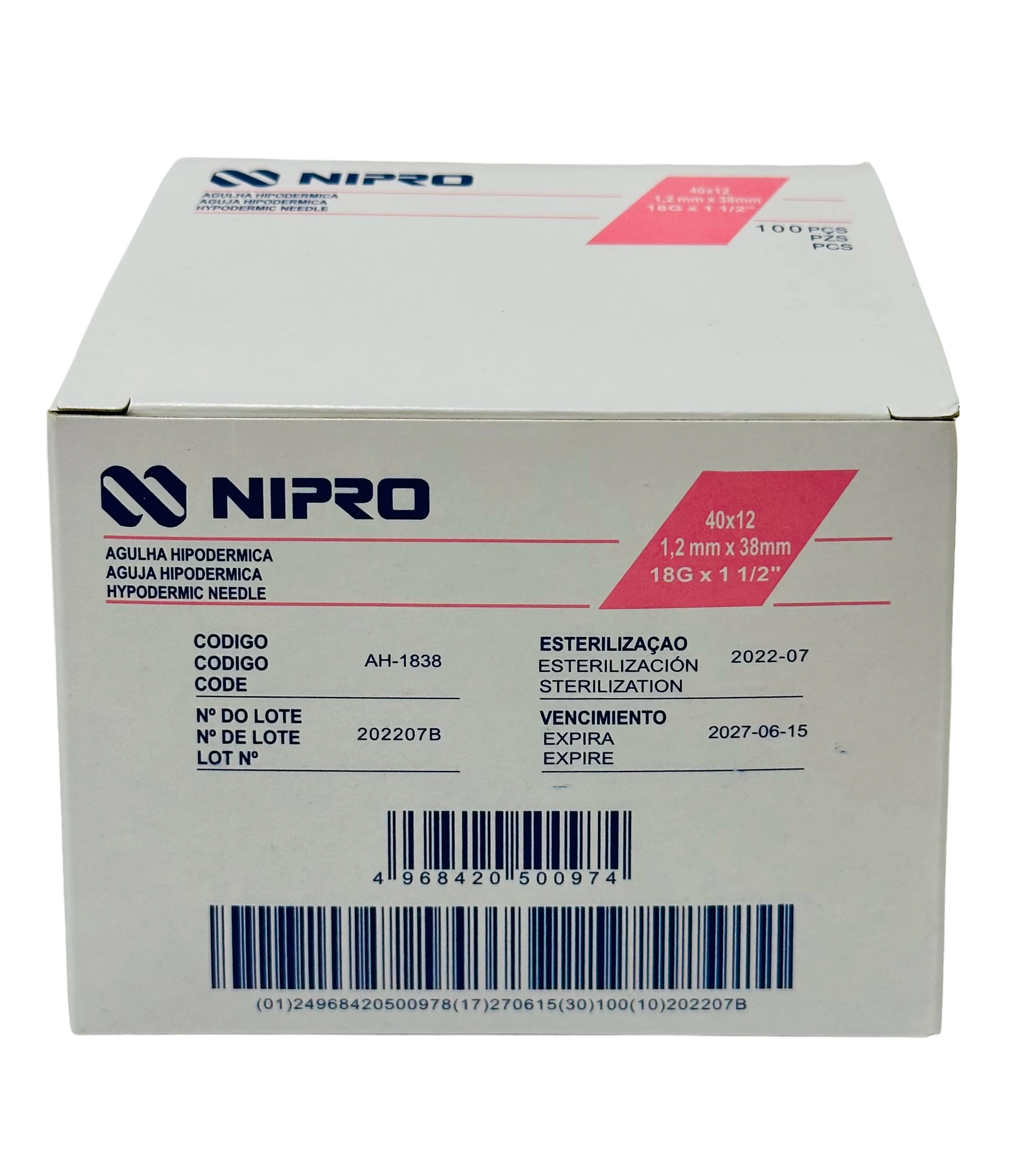Aguja Hipodermica 18Gx38 Rosa C/100 Npro. Producto para uso clínico y hospitalario. Verifica compatibilidades y especificaciones del fabricante antes de su aplicación.