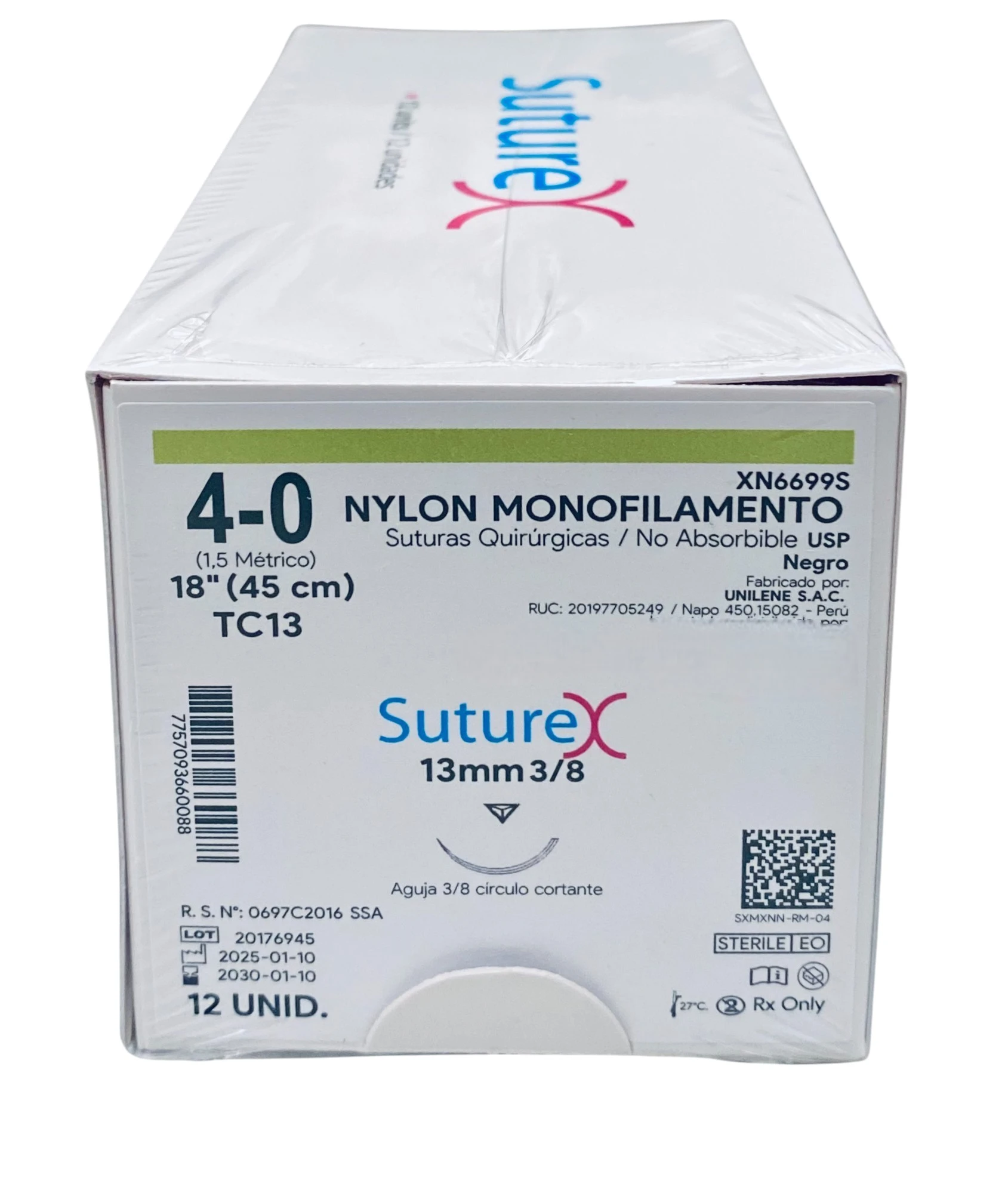 Sutura de nylon no absorbible, 4-0 aguja 13 mm, 3/8 círculo reverso cortante para penetración precisa y menor trauma tisular. Longitud estándar 45 cm; color azul/negro para alta visibilidad. Indicada para cierre de piel y tejidos de alta resistencia. Presentación: caja con 12 piezas estériles.