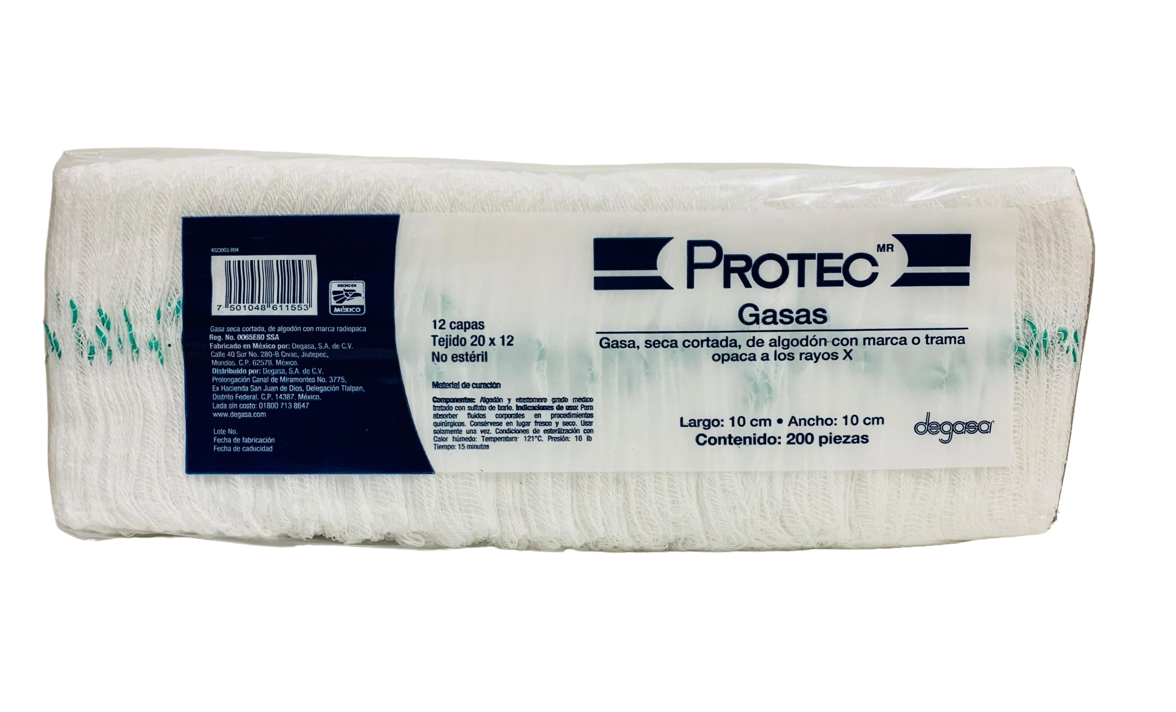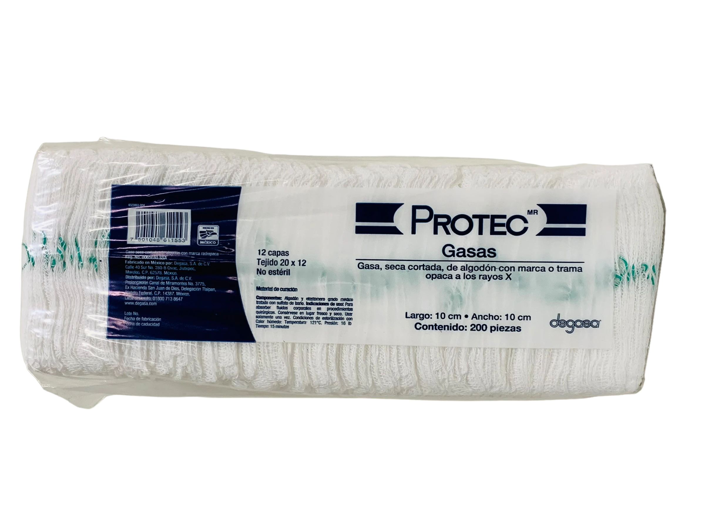 Gasa no estéril de 10×10 cm con tejido suave y buena absorción, ideal para limpieza de heridas, compresión y uso general. No deja residuos y permite una ventilación adecuada de la piel. Presentación: paquete con 200 piezas (o equivalente). Uso desechable para mayor higiene.