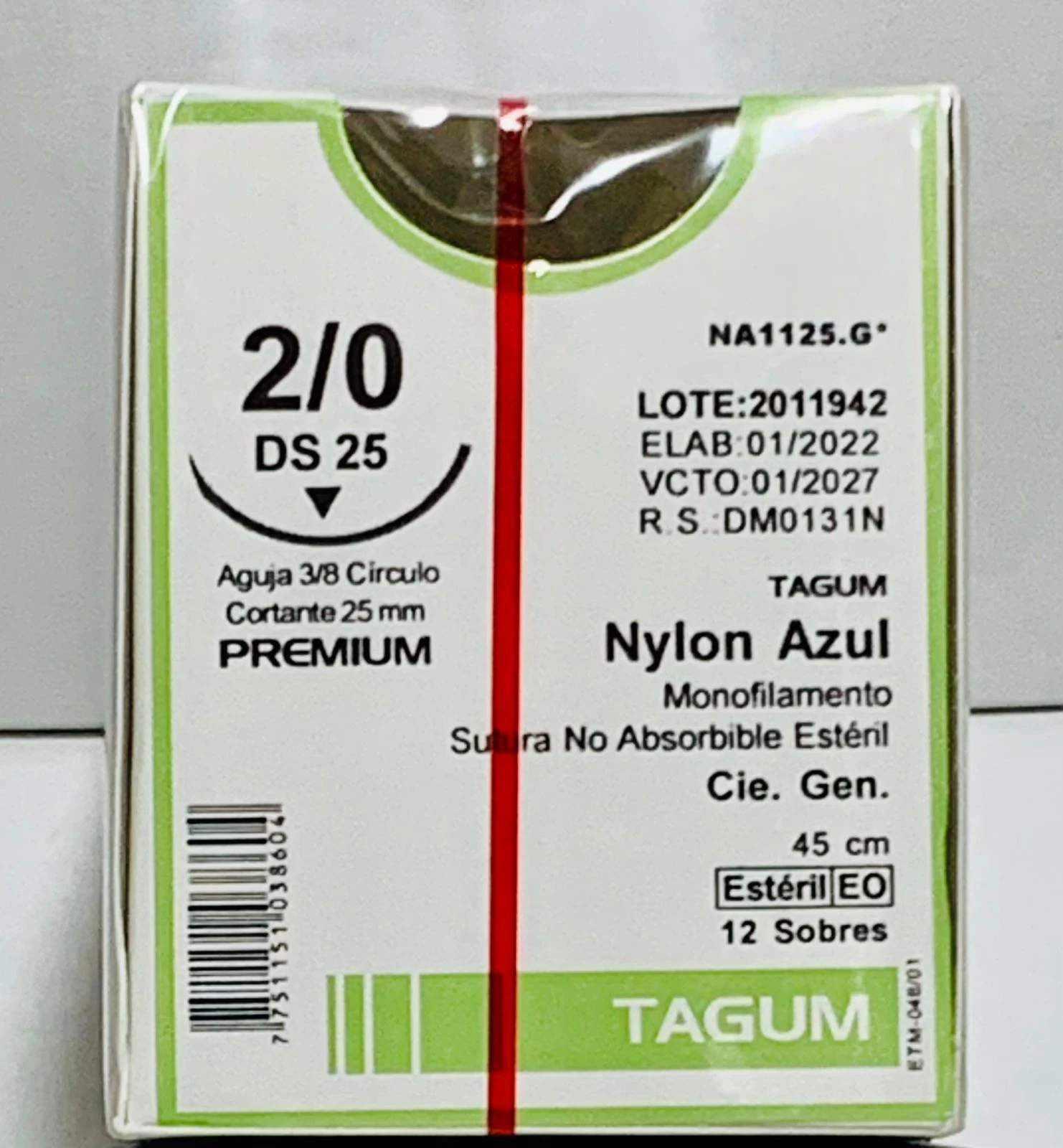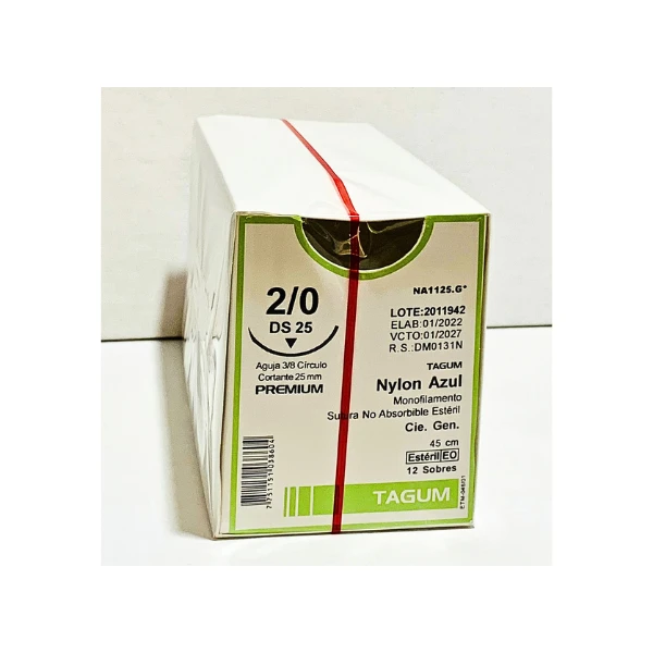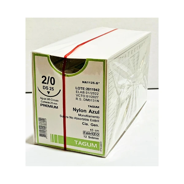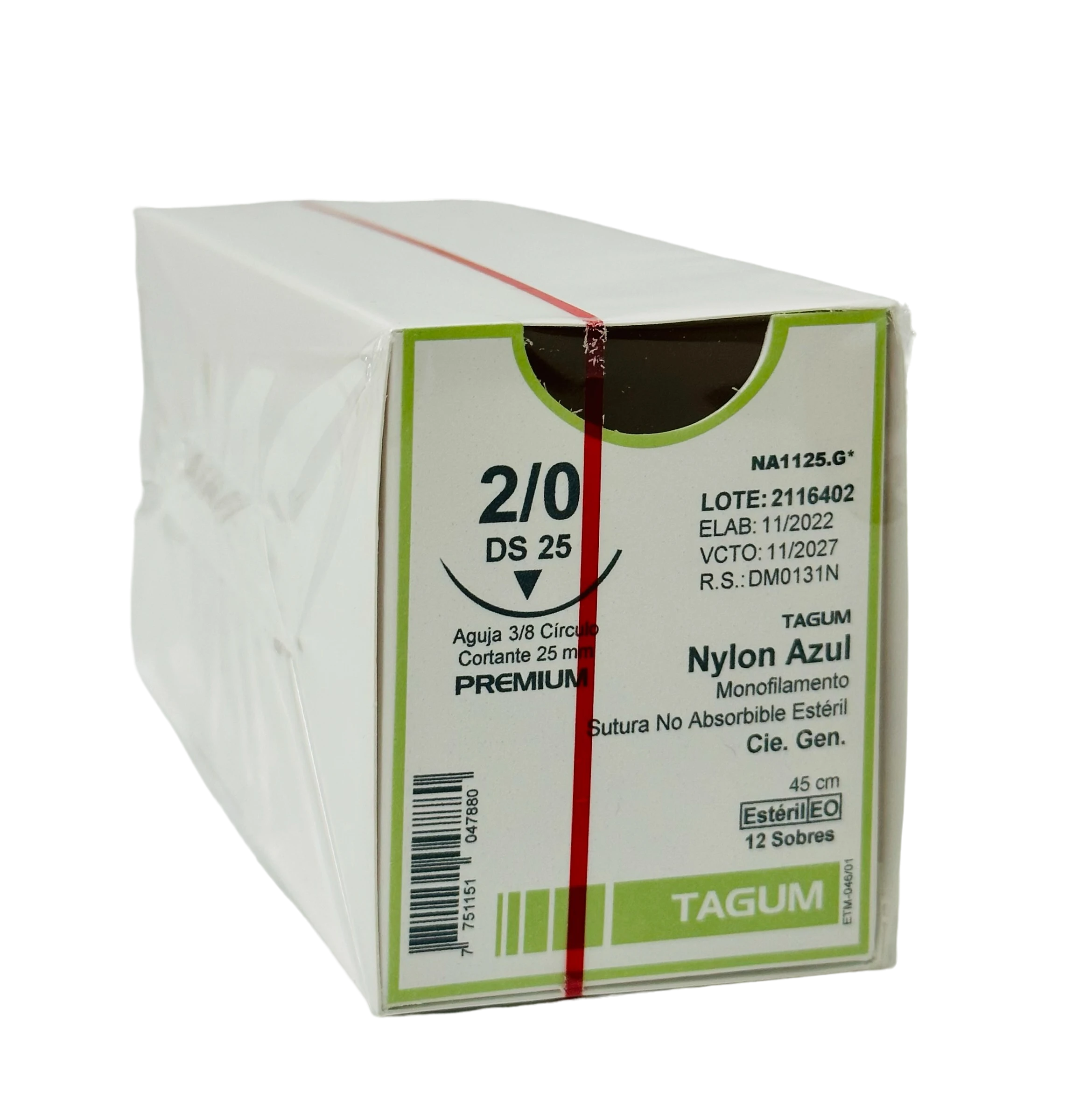 Sutura de nylon no absorbible, 2-0 aguja 25 mm, 3/8 círculo reverso cortante para penetración precisa y menor trauma tisular. Longitud estándar 45 cm; color azul/negro para alta visibilidad. Indicada para cierre de piel y tejidos de alta resistencia. Presentación: caja con 12 piezas estériles.