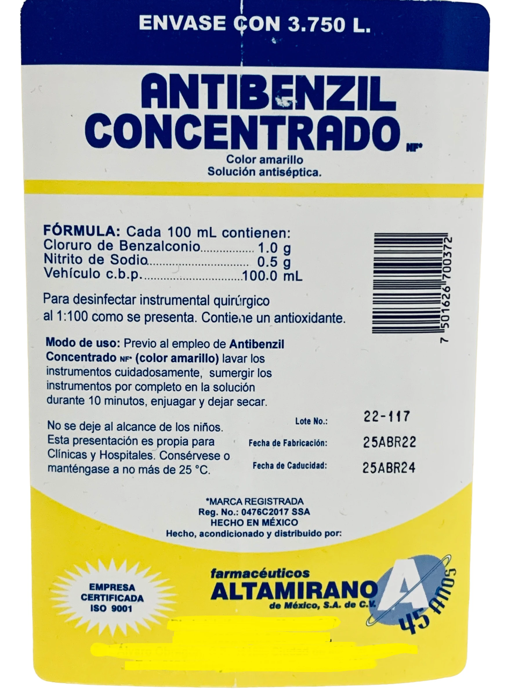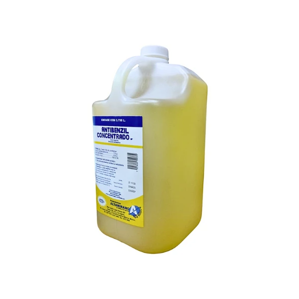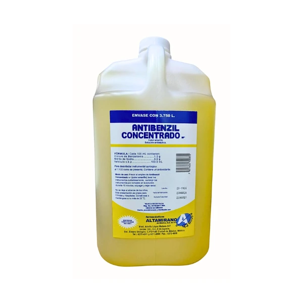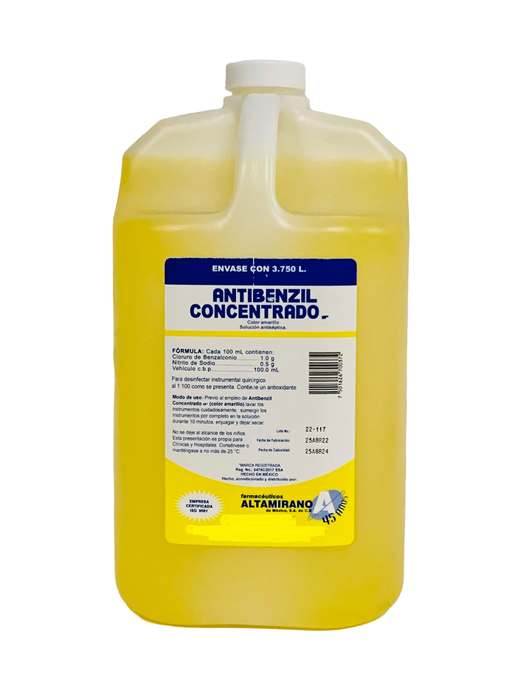 Antibenzil Concentrado Amarillo 3.75 Lt. Producto para uso clínico y hospitalario. Verifica compatibilidades y especificaciones del fabricante antes de su aplicación.