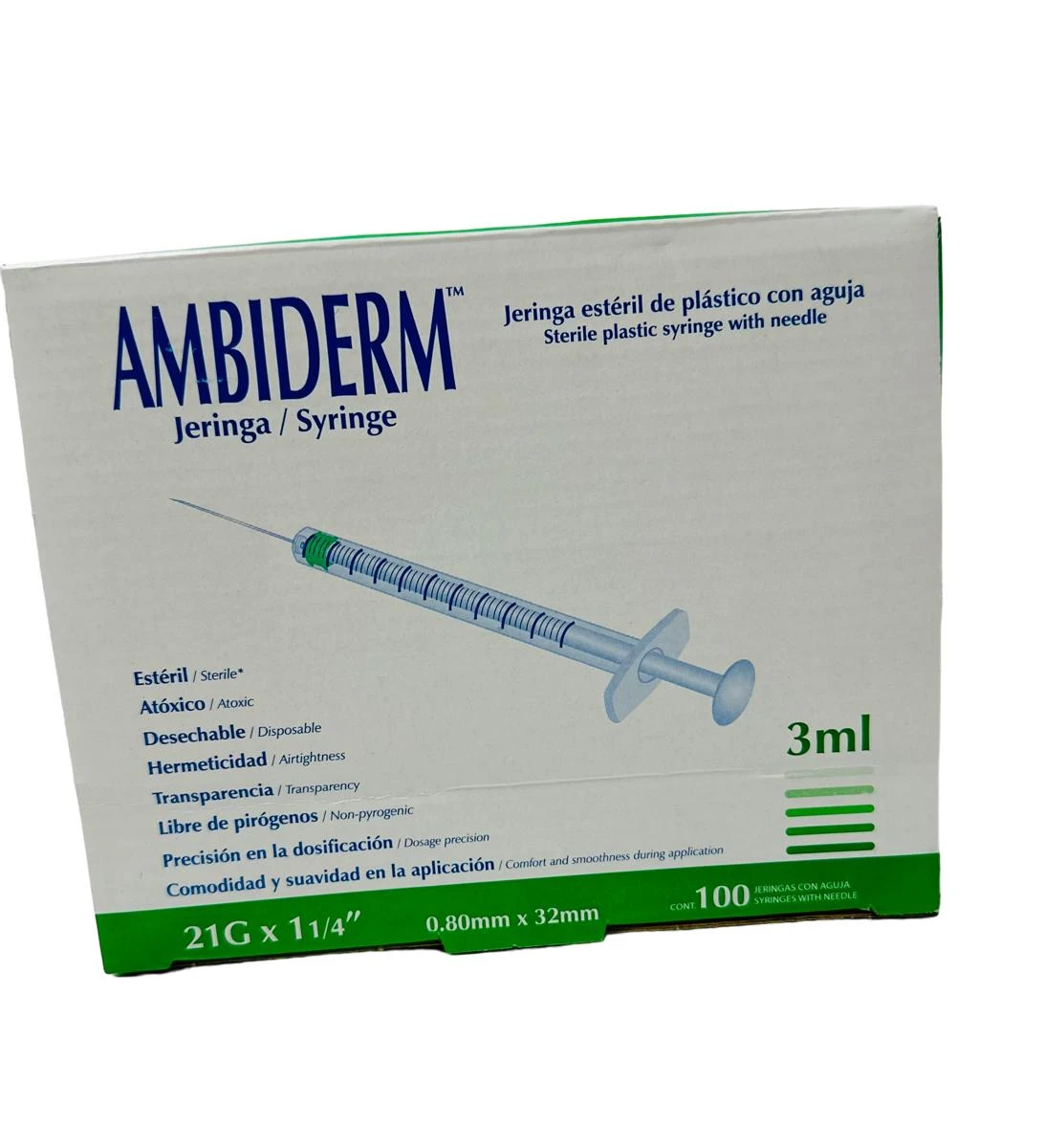 Jeringa 3Ml 21X32 Verde C/100 Ambiderm. Producto para uso clínico y hospitalario. Verifica compatibilidades y especificaciones del fabricante antes de su aplicación.