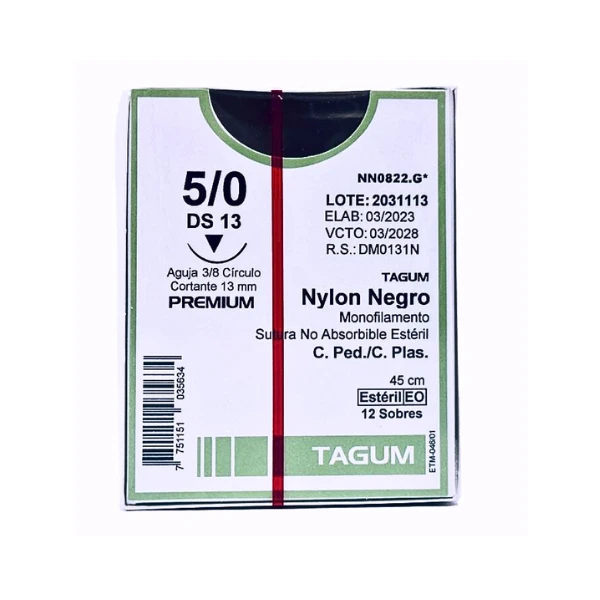 Sutura de nylon no absorbible, 5-0 aguja 13 mm, 3/8 círculo reverso cortante para penetración precisa y menor trauma tisular. Longitud estándar 45 cm; color azul/negro para alta visibilidad. Indicada para cierre de piel y tejidos de alta resistencia. Presentación: caja con 12 piezas estériles.
