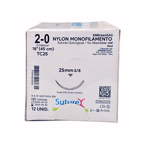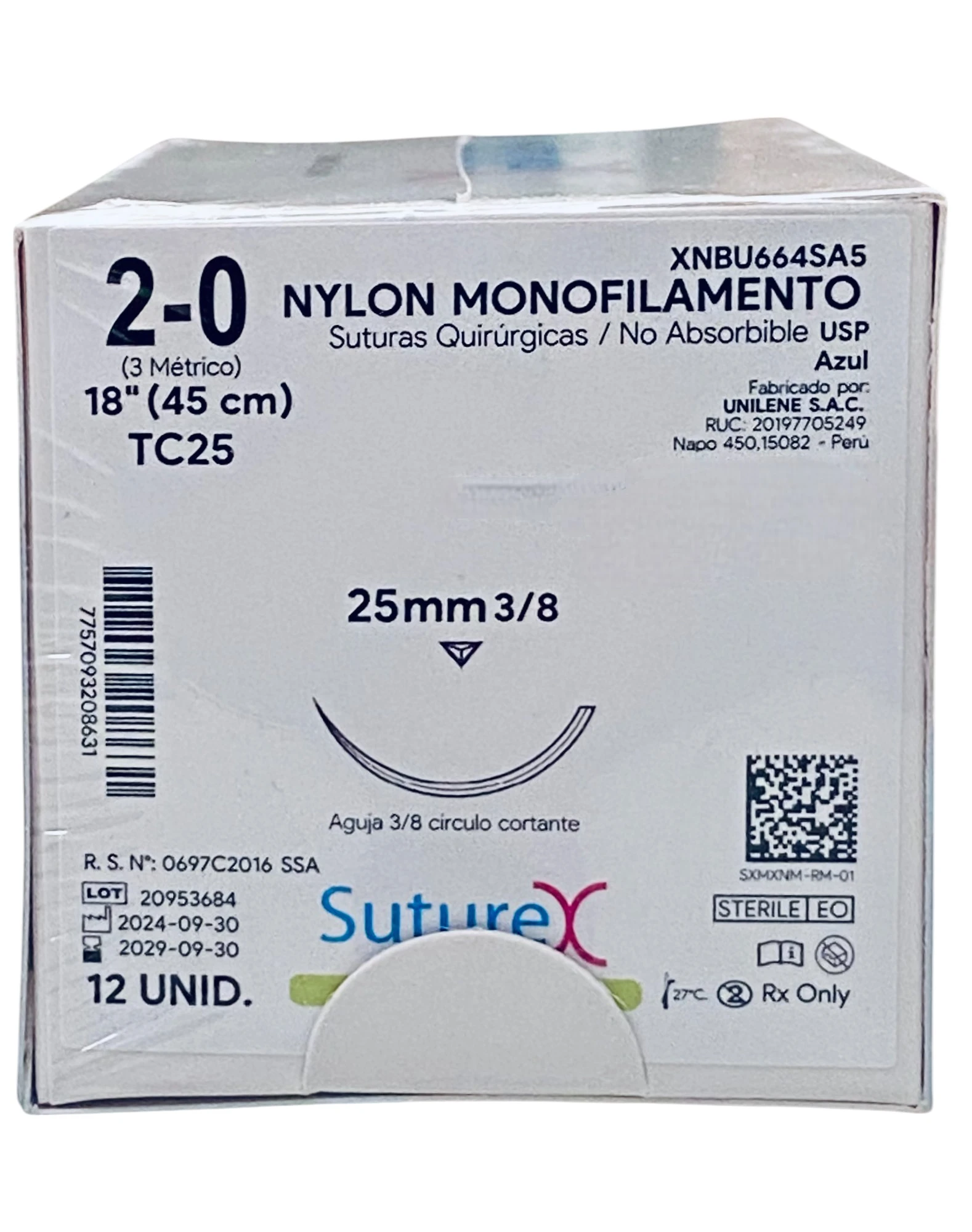 Sutura de nylon no absorbible, 2-0 aguja 25 mm, 3/8 círculo reverso cortante para penetración precisa y menor trauma tisular. Longitud estándar 45 cm; color azul/negro para alta visibilidad. Indicada para cierre de piel y tejidos de alta resistencia. Presentación: caja con 12 piezas estériles.