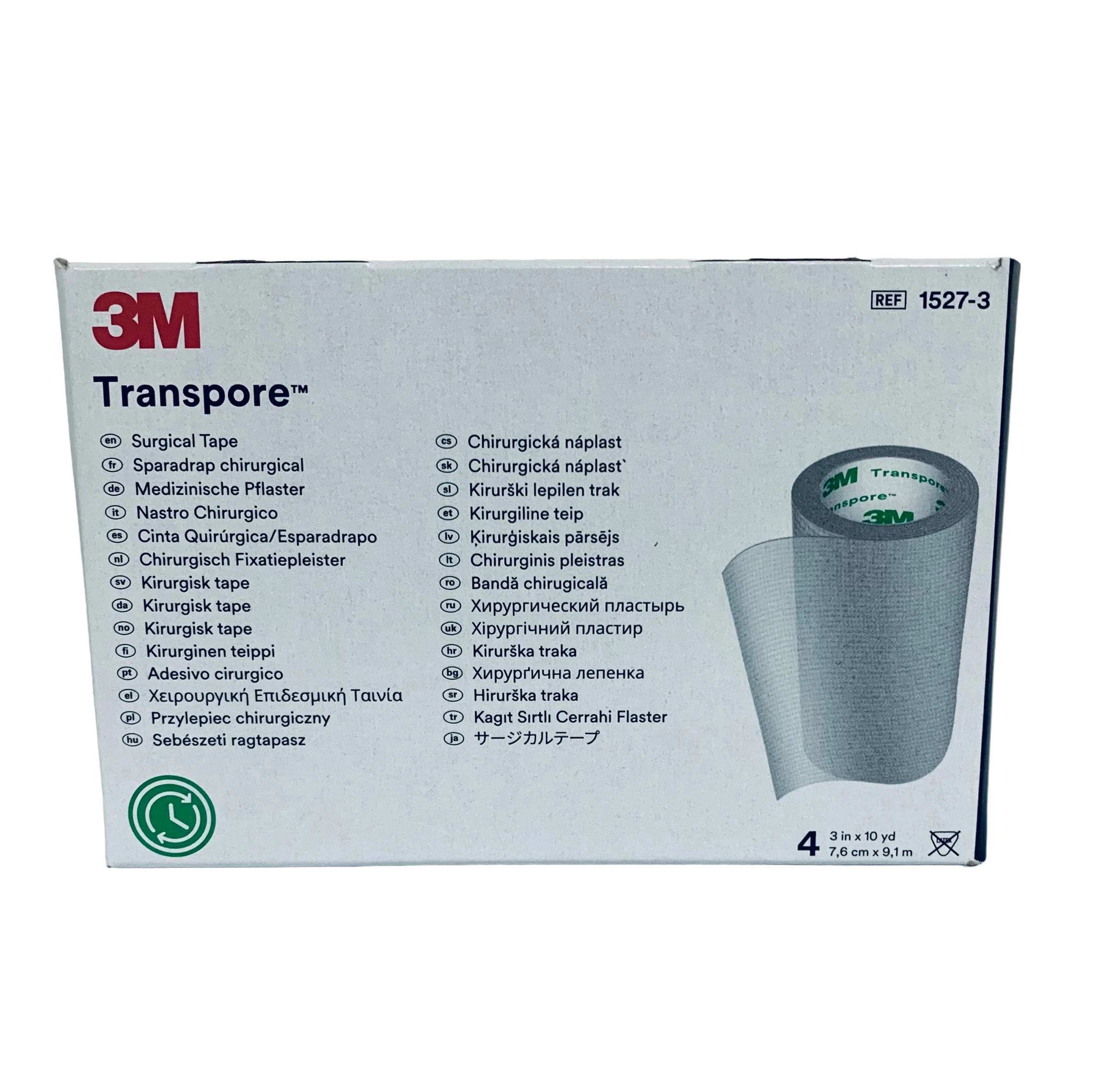 Cinta quirúrgica 3M Transpore de 7.5 cm, hipoalergénica y libre de látex, con corte fácil en ambas direcciones. Flexible e impermeable para una fijación confiable de apósitos y dispositivos, con retiro suave para la piel. Contenido típico: caja con 6 rollos.